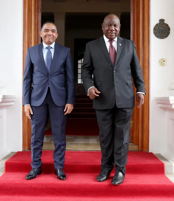 President Cyril Ramaphosa welcomes Madagascar President, Colonel Michaël Randrianirina, during a working visit at Mahlamba Ndlopfu, the official residence of the South African president in Pretoria.