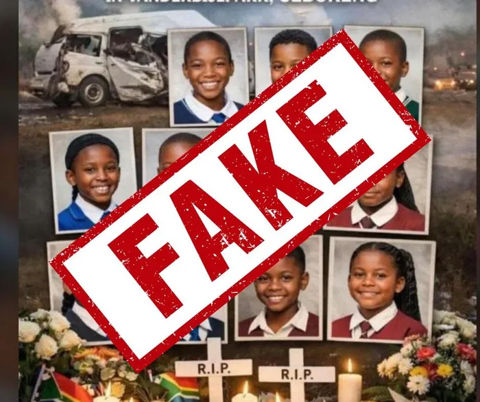 A viral image showing smiling schoolchildren in uniform, alongside white doves and crosses marked “RIP”, was widely shared online as depicting the young victims of the Vaal taxi crash.