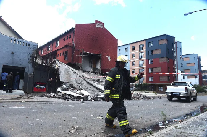Emergency Medical Services(EMS) at the collapsed building in New Doornfontein, Johannesburg, where a student and three security guards sustained third-degree burns following a transformer explosion.