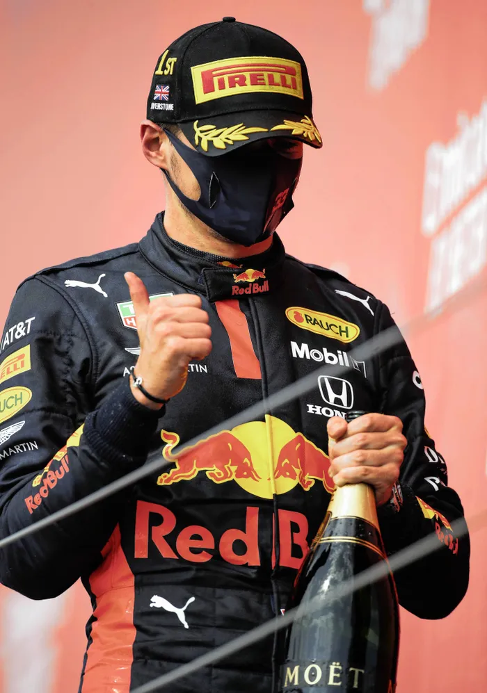 epa08593623 Dutch Formula One driver Max Verstappen of Aston Martin Red Bull Racing celebrates on the podium after winning the 70th Anniversary Formula One Grand Prix of Great Britain at the Silverstone Circuit, in Northamptonshire, Britain, 9 August 2020. EPA/Bryn Lennon/ Pool