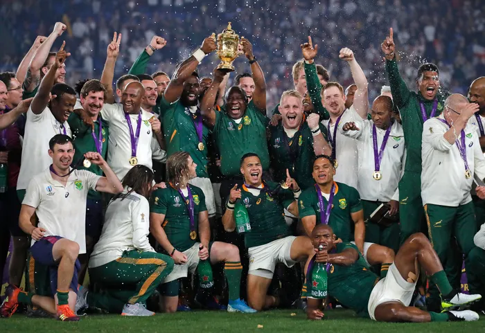 Springbok captain Siya Kolisi holds the Webb-Ellis Cup aloft with South African President Cyril Ramaphosa after beating England in the Rugby World Cup final. Picture: Christophe Ena, AP