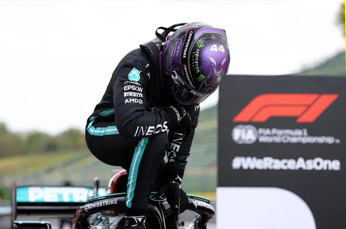 Mercedes' Lewis Hamilton celebrates after qualifying in pole position for the Emilia Romagna Grand Prix at Imola. Picture: Bryn Lennon/Reuters