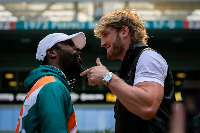 Floyd “Money” Mayweather and Logan “The Maverick” Paul face-off during a press conference at Hard Rock Stadium. Photo: Eva Marie Uzcategui/AFP