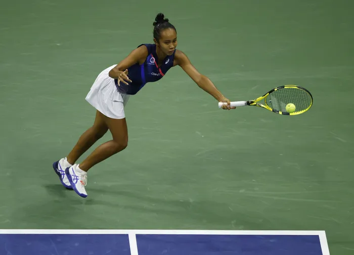 Leylah Fernandez of Canada hits a return to Aryna Sabalenka of Belarus during their semi-final match on the eleventh day of the US Open Tennis Championships. Picture: EPA, Jason Szenes