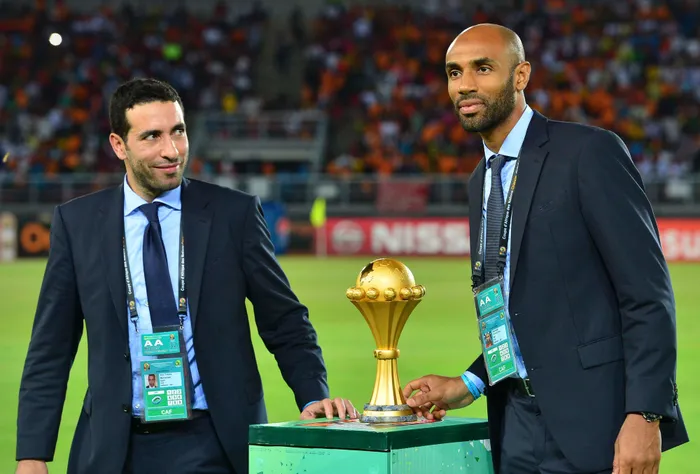 Caf ambassadors Mohamed Aboutrika (left) and Frederick Kanoute (right) with the trophy before the 2015 Africa Cup of Nations final football match between Ivory Coast and Ghana at the Bata Stadium in Bata, Equatorial Guinea on 8 February 2015. Picture: Barry Aldworth, BackpagePix