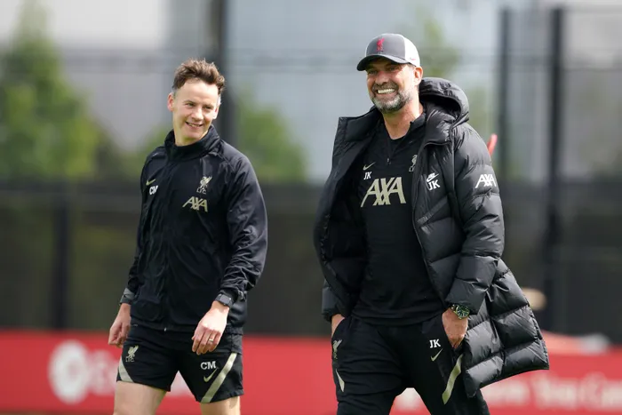 Liverpool manager Jurgen Klopp (right) and first-team fitness coach Conall Murtagh during a media day at the AXA Training Centre in Liverpool ahead of the UEFA Champions League Final in Paris on Saturday. Picture: Peter Byrne