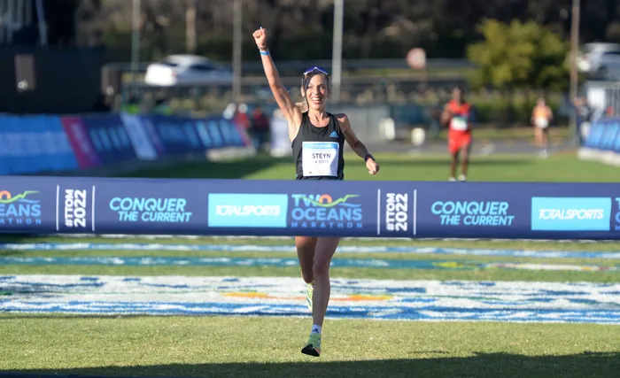 Gerda Steyn wins the Ultra Marathon women's race in record time during the 2022 Two Oceans Marathon at UCT Green Mile in Cape Town on 17 April 2022. Picture: Ryan Wilkisky/BackpagePix