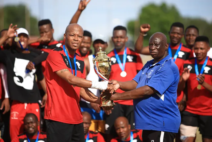 Seen is the winning captain from Real Madrid Masters, Andrew Lenyora receiving the trophy from the secretary of the Sol Plaatje Masters Football League, Archie Jack. Picture: Danie van der Lith