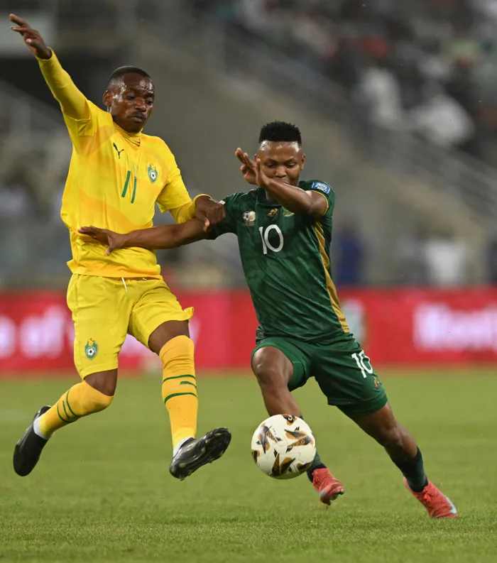 Khama Billiat of Zimbabwe challenges Mohau Nkota of South Africa during the 2026 World Cup Qualifier at Moses Mabhida Stadium in Durban on Friday that ended 0-0 leaving Bafana Bafana frustrated and lying second in Group C. | BackpagePix
