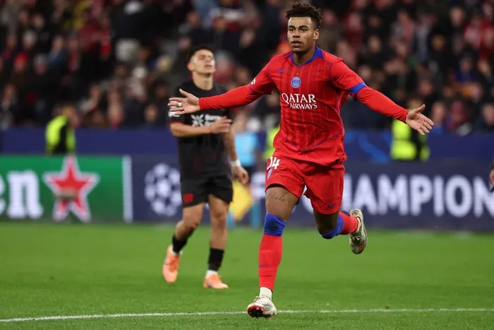 Paris Saint-Germain's French midfielder #14 Desire Doue celebrates scoring the 1-4 goal during the UEFA Champions League football match between Bayer 04 Leverkusen and Paris Saint-Germain (PSG) at the BayArena stadium in Leverkusen, western Germany on October 21, 2025. Picture: Franck Fife/AFP