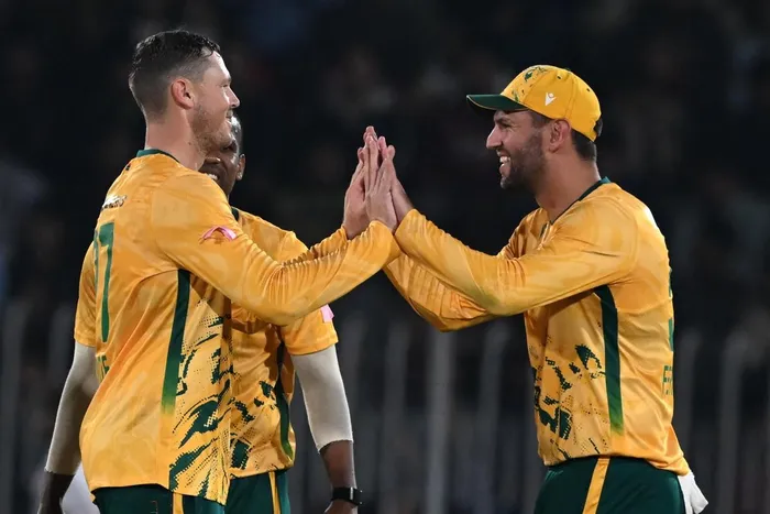 South Africa's George Linde (L) celebrates with teammates after taking the wicket of Pakistan's Faheem Ashraf (not pictured) during the first T20 international cricket match at the Rawalpindi Cricket Stadium in Rawalpindi on October 28, 2025. Picture: Farooq Naeem/AFP
