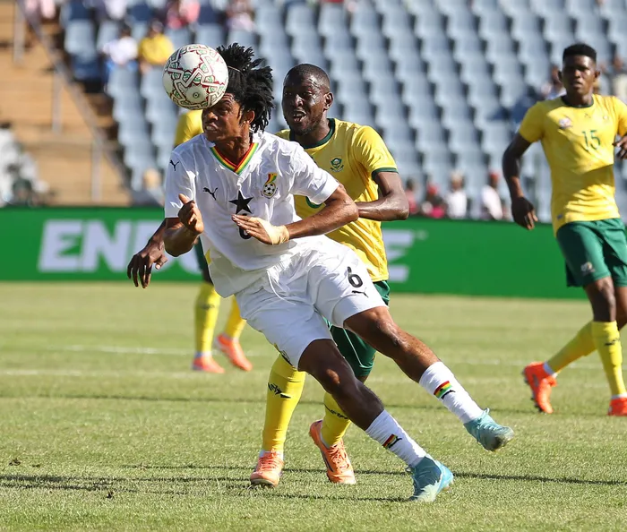 Etse Dogli of Ghana is challenged by Aubrey Modiba of South Africa during their international friendly clash at Dobsonville Stadium on Tuesday. Photo: BackpagePix
