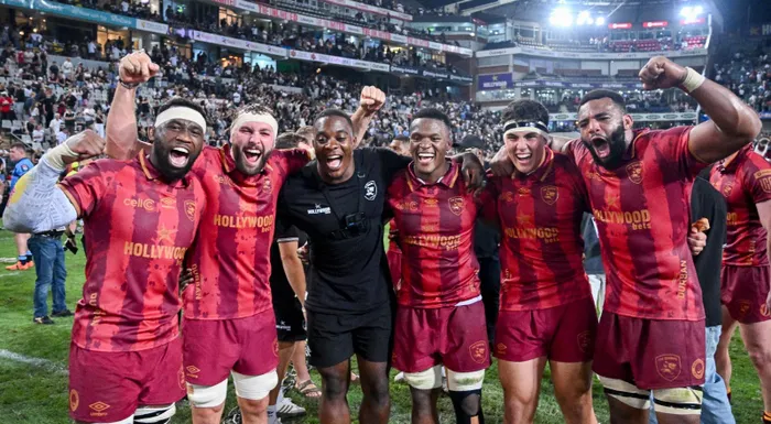 Hollywoodbets Sharks players Siya Kolisi of, Nick Hatton, Manu Tshituka, Phepsi Buthelezi, Matt Romao and Vincent Tshituka celebrate after beating Bulls 21-12 in the United Rugby Championship derby at Kings Park in Durban on Saturday.