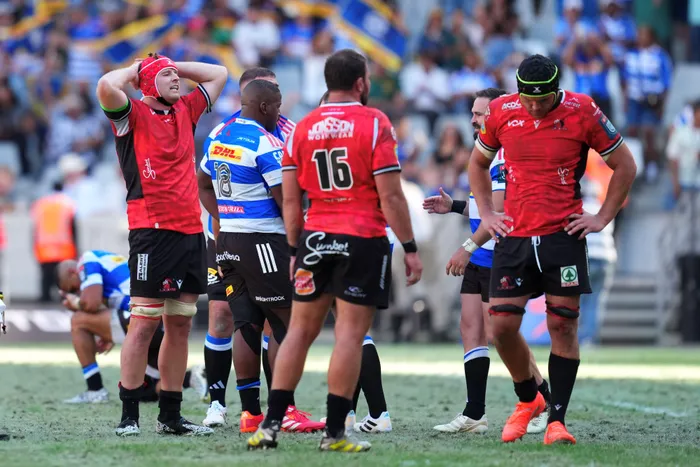 Captain Francke Horn (left) and his Lions teammates were dejected after the final whistle on Saturday afternoon in Cape Town after coming close to an upset in the URC against the Stormers at the DHL Stadium.