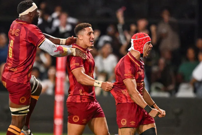 Winger Edwill van der Merwe (right) celebrates his try that sealed the URC victory over the Bulls with flanker Siya Kolisi and flyhalf Jordan Hendrikse on Saturday in Durban.