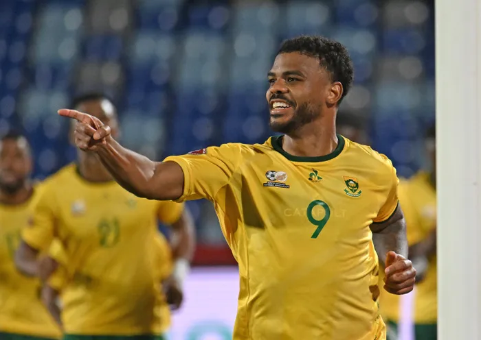 Forward Lyle Foster celebrates after scoring for Bafana Bafana.