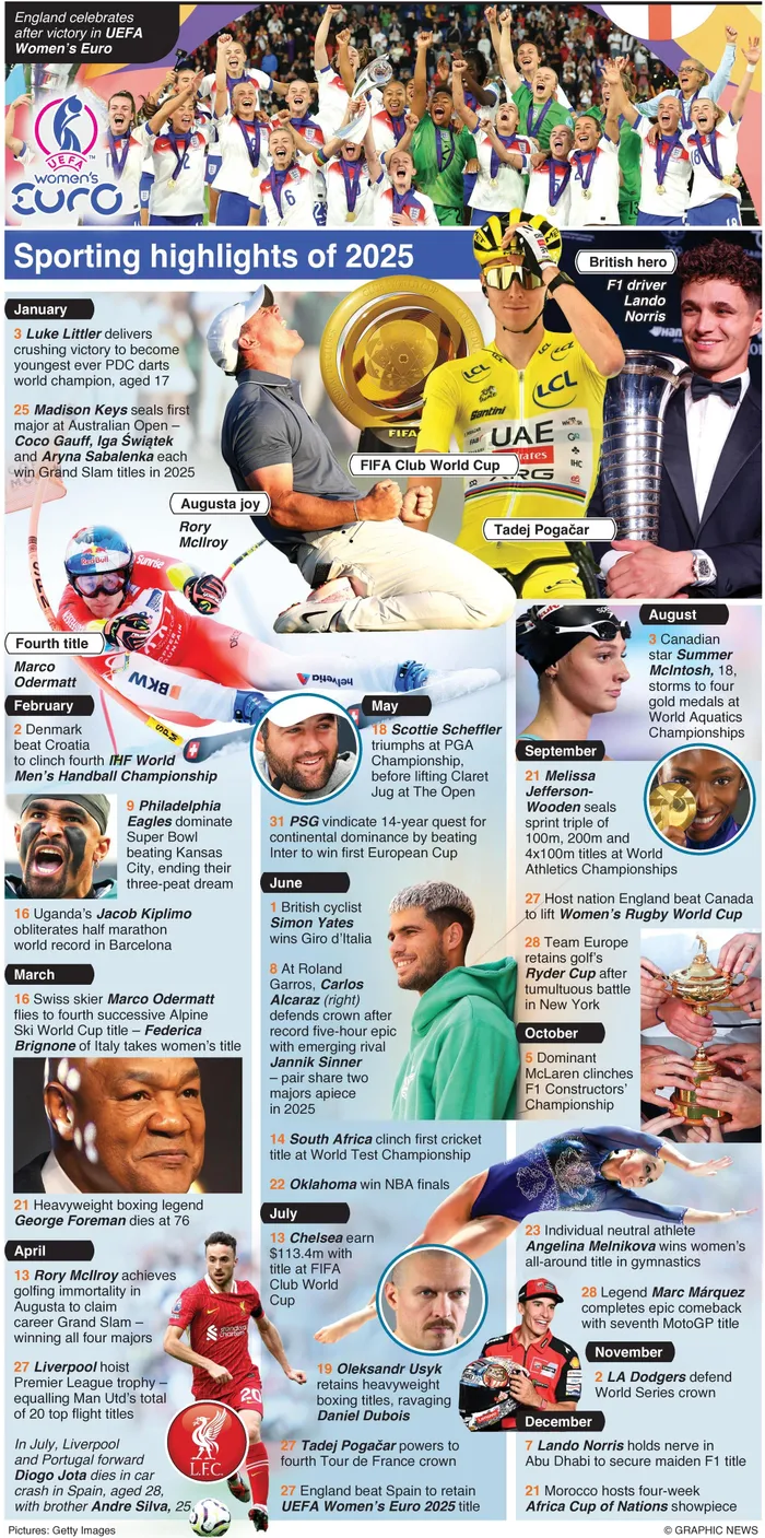 Individuals hitting the heights included swimming star Summer Mcintosh, British driver Lando Norris claiming a maiden F1 World title, cycling star Tadej Pogacar, athletes Melissa Jefferson-Wooden and Jacob Kiplimo, golfer Scottie Scheffler, and tennis rivals Carlos Alcaraz and Jannik Sinner.