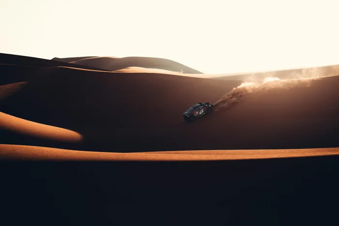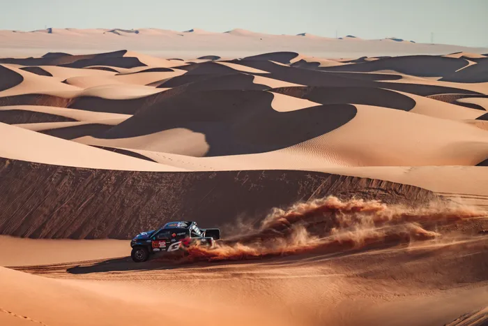 A Toyota Gazoo vehicle drives down one of the dunes.