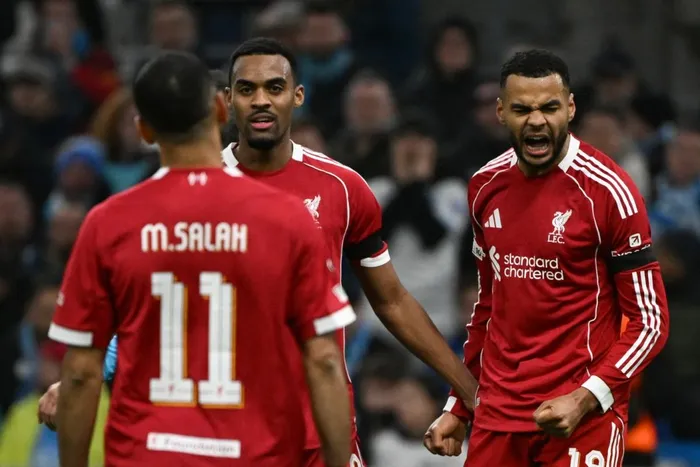 Liverpool's Dutch forward Cody Gakpo (R) celebrates scoring his team's third goal during the UEFA Champions League, league phase day 7, football match against Olympique de Marseille (OM) at the Stade Velodrome in Marseille, southern France, on January 21, 2026. Picture: Miguel Medina/AFP