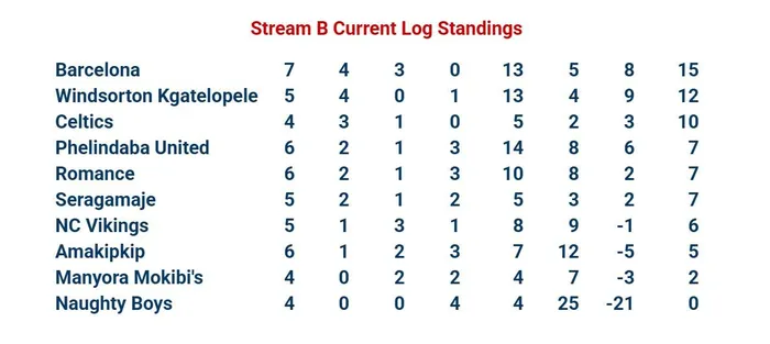 In Stream B, Romance delivered the standout scoreline, routing Naughty Boys 6–0, while league leaders FC Barcelona were held to a 0–0 draw by Celtics. Windsorton Kgatelopele’s 4–1 win over Amakipkip kept them firmly in contention.