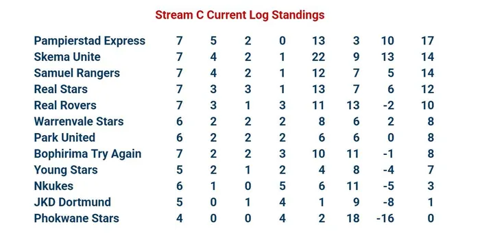 Stream C also produced strong performances: Samuel Rangers beat Phokwane Stars 4–1, Park United edged Real Rovers 3–1, and Pampierstad Express continued their excellent run with a 2–1 win over JKD Dortmund. Real Stars and Skema Unite shared the points in a 2–2 draw.
