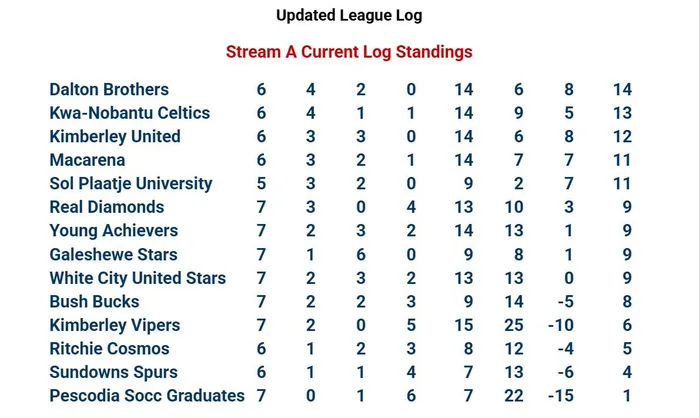 In Stream A, Dalton Brothers lead on 14 pts, followed by Kwa-Nobantu Celtics (13) and Kimberley United (12). At the foot, Pescodia Soccer Graduates have 1 pt. Stream B sees FC Barcelona top the stream on 15 pts; Naughty Boys are bottom on 0. As for Stream C, Pampierstad Express lead on 17 pts, while Phokwane Stars are bottom on 0.