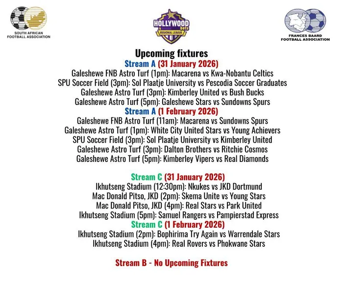 A look ahead to the fixtures in the Safa Frances Baard Regional League games to played over the weekend of January 31 to February 1.