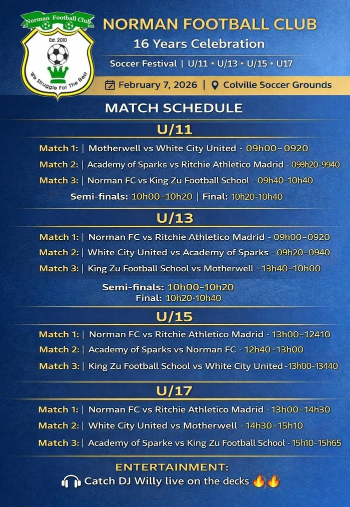 Norman Football Club celebrates 16 years with a youth soccer tournament at Colville Soccer Grounds. U-11 to U-17 teams compete, showcasing talent, teamwork, and soccer development, with winners announced at the end of an action-packed day.