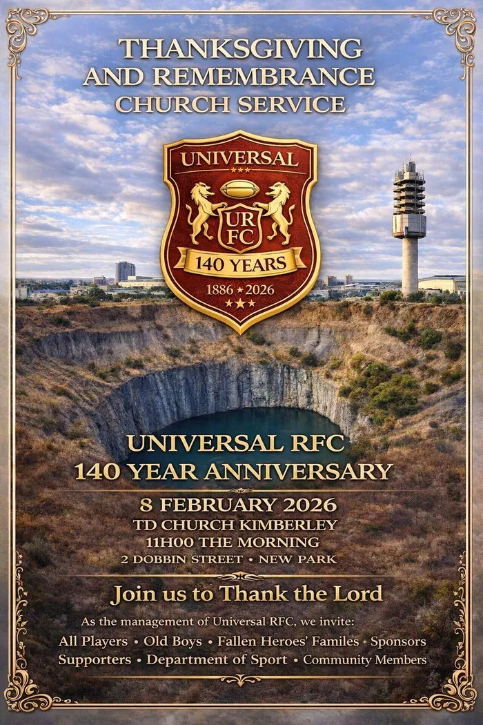 Universal Rugby Football Club celebrates 140 years with a Thanksgiving and Remembrance Service in Kimberley, honouring generations of players and volunteers while reflecting on its enduring role in Northern Cape community sport and shared heritage.