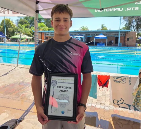 Dewet Gouws captured 10 gold medals and the prestigious NCASA President’s Award, highlighting not only his dominance in the pool but also his leadership, integrity, and lasting impact on Northern Cape swimming.