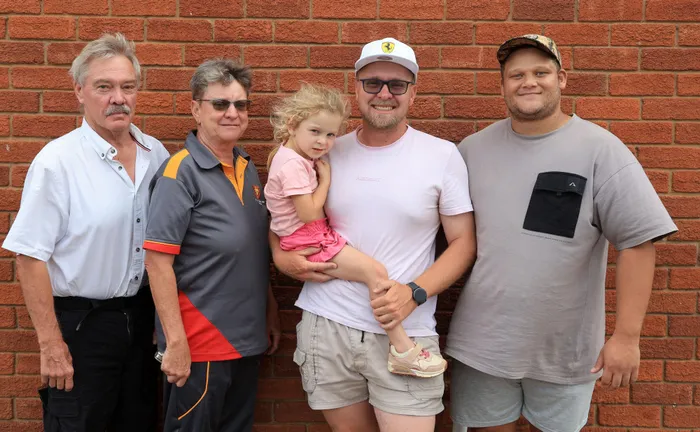 Arriving at the airport, it was only CP's family there to welcome the champion. Seen are Etienne Mathewson, Annelie Mathewson, daughter of CP, Lize Mathewson, CP Mathewson, and Roland Blunden.