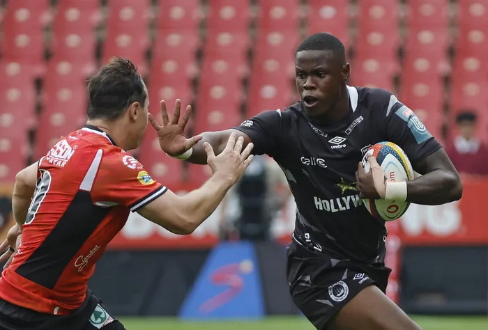 Sharks fullback Aphelele Fassi tries to hand off a Lions defender during their United Rugby Championship clash.