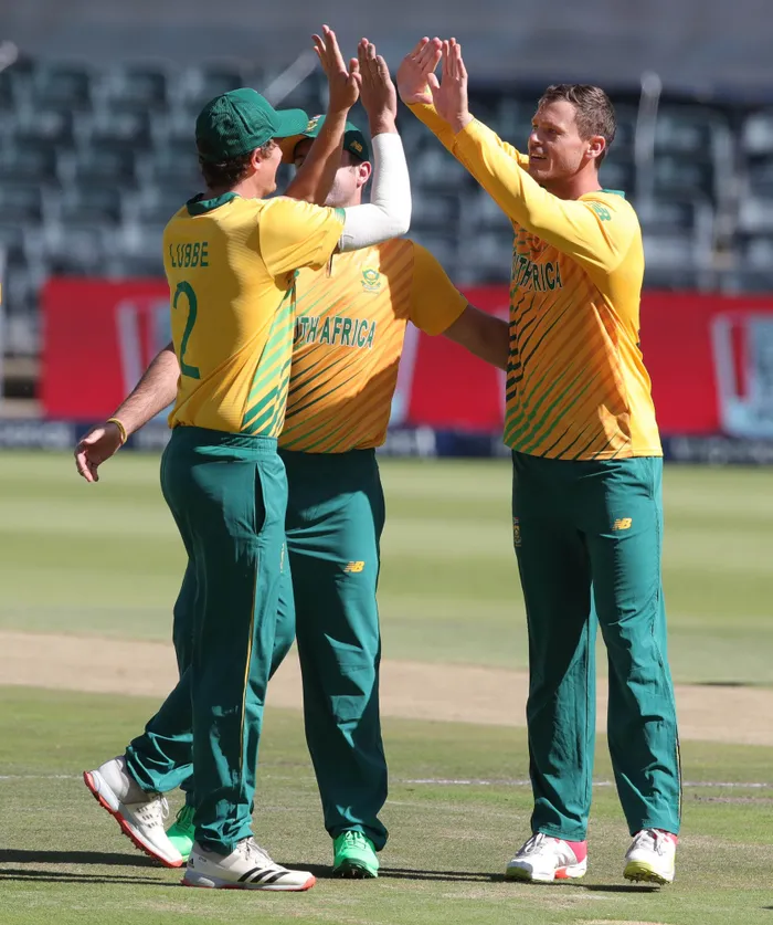 South Africa’s George Linde clebrates with teammates after picing up the wicket of Pakistan’s Mohammad Rizwan during the second T20 International at Wanderers Stadium in Johannesburg on Monday. Picture: Samuel Shivambu, BackpagePix