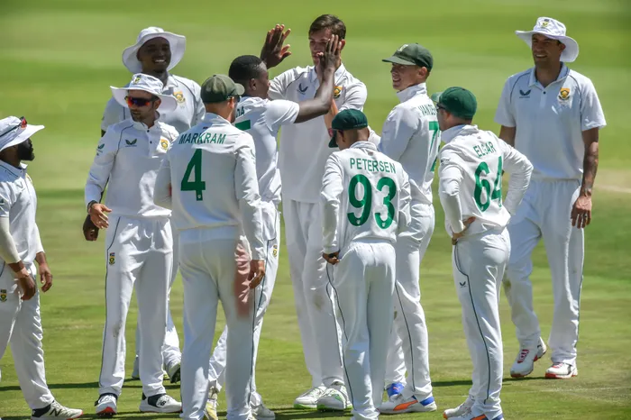 Marco Jansen of South Africa celebrates with teammates after getting the wicket of KL Rahul of India during day one of the 2nd Test match against India at the Wanderers in Johannesburg on Monday Marco Jansen of South Africa celebrates with teammates after getting the wicket of KL Rahul of India during day one of the 2nd Test match against India at the Wanderers in Johannesburg on Monday. Photo: Christiaan Kotze/BackpagePix